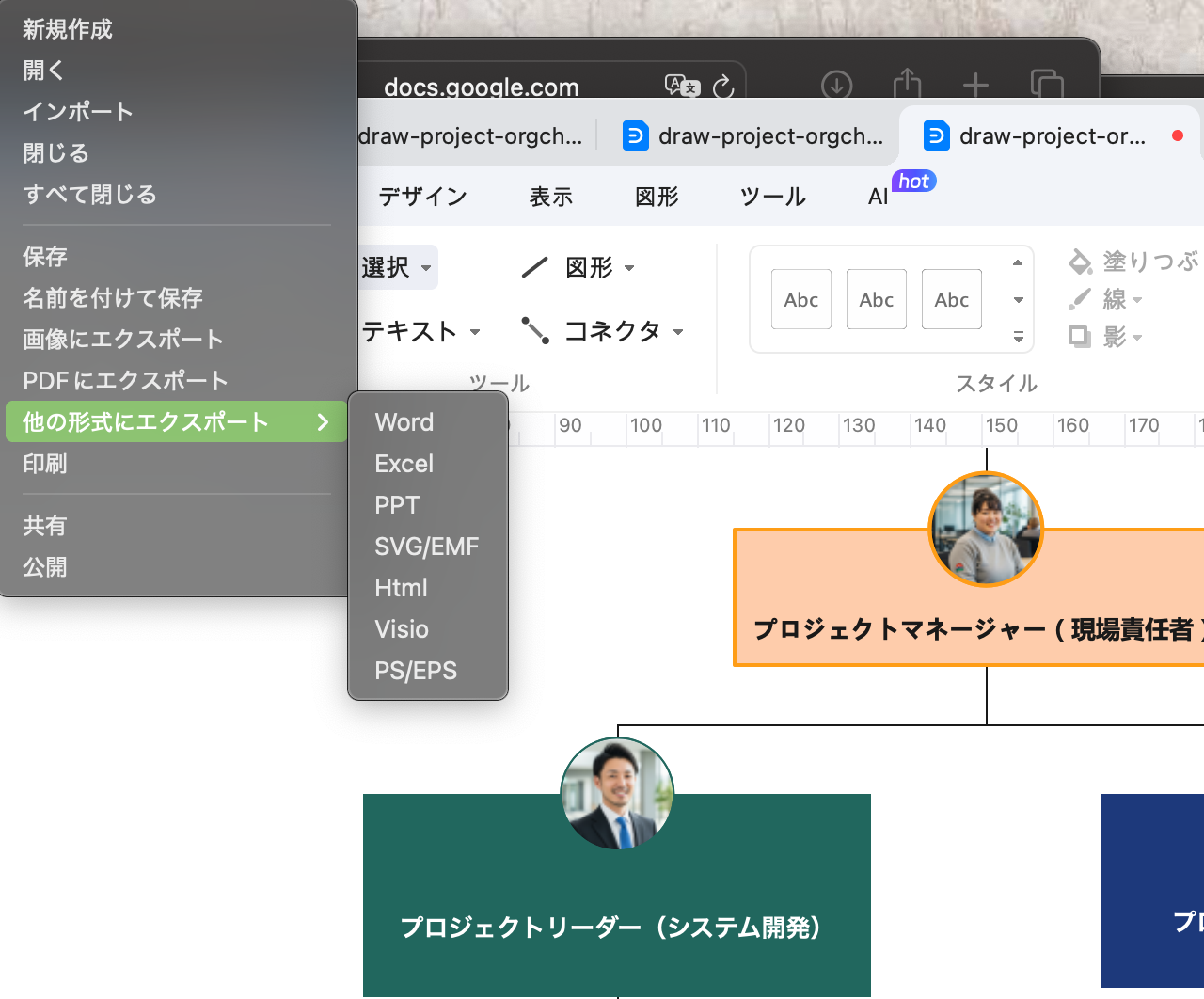 完成したプロジェクト体制図は、PDFやOfficeファイル、画像など様々な形式でエクスポートでき、社内共有や資料への添付もスムーズです。これらの機能により、EdrawMaxは組織図作成の効率と質を飛躍的に向上させるツールだと言えるでしょう