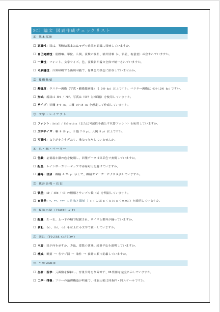 SCI 論文における図表作成の基本原則についてチェックリスト整理して示します。編集者および査読者の視点を踏まえ、図表の正確性、自己完結性、一貫性、印刷適性といった重要要件を中心に解説します。さらに、解像度、ファイル形式、サイズ、配色、統計表現、有意差の表記方法など、投稿時に遵守すべき具体的な技術基準を体系的にまとめています。